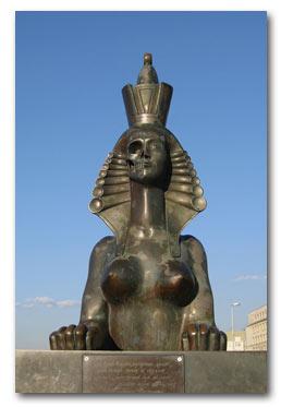 Лица сфинксов рассечены по вертикали: одна половина — живое лицо, другая, обращенная в сторону «Крестов», — в виде черепа.