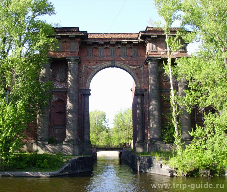Самая известная часть ансамбля острова – гигантская кирпичная арка Новой Голландии, сооруженная над входом в канал. Автор постройки – Жан Батист Валлен-Деламот, по проекту которого арка соединила два корпуса, расположенных вдоль Мойки. Под аркой проходит канал, проложенный между Мойкой и бассейном-гаванью в центре острова. Постройка известна тосканскими колоннами и выделяется сочетанием красного кирпича и тесаного гранита. Высота арки – 23 метра, ширина пролета – немногим более 8 метров.