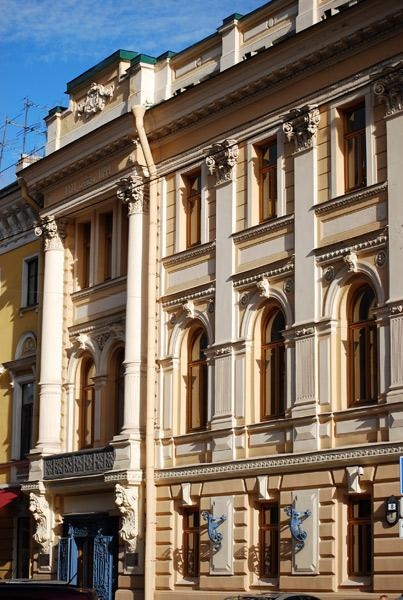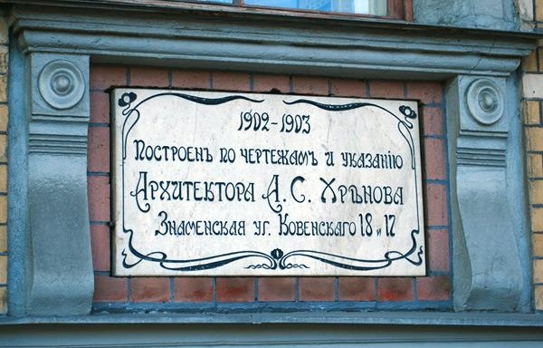 Хренов Александр Сергеевич (1860–1926) - архитектор и художник-акварелист. В 1884 г. окончил Академию художеств, стал преподавателем рисовальной школы Общества поощрения художеств, членом правления Общества русских акварелистов. В Санкт-Петербурге им были перестроены и построены заново десятки зданий, в том числе Общество взаимного кредита (Итальянская ул., 8), доходные дома на Кирочной, 9 и 27, Фурштатской, 47, улицах, на Невском проспекте, 140. Для доходных домов на Таврической улице, 17, на улицах Восстания, 18, Рубинштейна, 4, 2-й Советской, 10б, характерны массивные эркеры, полихромная облицовка, использование декоративного металла и витражей, оригинальные круглые шахты лифтов. Наиболее весомым вкладом в облик города стала застройка нечётной стороны Таврической улицы, где он построил и ряд собственных доходных домов. Среди других построек А. С. Хренова выделяется дом 17/18 по Ковенскому пер. – помимо лепнины, витражей и кованых решеток на нем уцелела мраморная памятная доска «Построен по чертежам и указанию архитектора А. С. Хренова». В 1920-х гг. А. С. Хренов жил и работал в Китае.