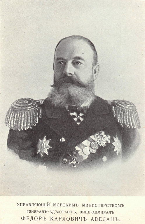 Авелан Федор Карлович (1839-1916) – государственный и военно-морской деятель. Родился в княжестве Финляндском, в дворянской семье. В 1857 г. окончил Морской кадетский корпус, служил в балтийском флоте. Совершил первое кругосветное путешествие (1869-1872), принимал участие в экспедиции к берегам Северной Америки (1878). По возвращении командовал флотскими экипажами, участвовал еще в двух кругосветных путешествиях, был начальником штаба Кронштадтского порта. В 1893 г назначен командующим эскадрой в Средиземном море, посланной во Францию для отдачи визита французским морякам, посетившим Кронштадт. Затем служил в Главном морском штабе. С 1903 г. – управляющий Морским министерством. В отставку ушел в мае 1905 г. в звании генерал-адъютанта. С 1914 г. – член Государственного совета. Награжден орденами Св. Александра Невского, Белого Орла, Св. Владимира, Св. Анны, Св. Станислава.