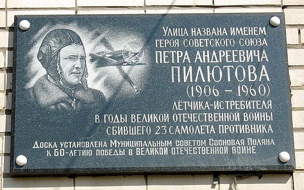 Пилютов Петр Андреевич (1906-1960) – военный летчик. Родился в Гомельской области, в семье крестьянина. Учился в средней школе. С 1924 г. – рабочий металлургического завода на Южном Урале. С 1928 г. служил в Красной Армии. Окончил школу авиационных техников (1932), затем военных летчиков. Был участником операции по спасению челюскинцев и всех военных действий 1938-1940 годов. В начале Великой Отечественной войны – заместитель командира истребительного авиационного полка (Ленинградский фронт). В декабре 1941 г. в воздушном бою у Ладожского озера принял бой с шестью истребителями противника, сбил два и, несмотря на ранения, сумел посадить свой подбитый самолет. К этому времени он уже совершил 170 боевых вылетов. За время войны сбил семнадцать вражеских самолетов. Герой Советского Союза (1943), удостоен других высоких правительственных наград.