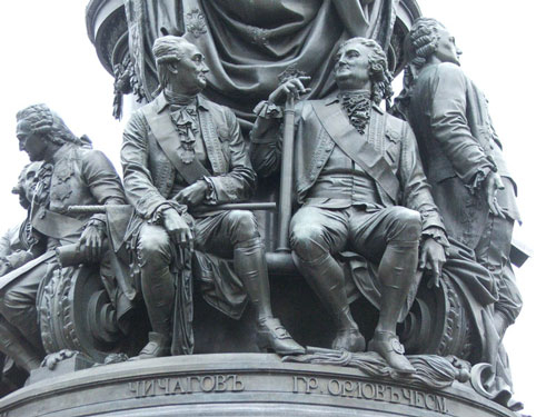 На горельефе памятника Екатерине Великой в Петербурге - пл. Островского, где изображены видные деятели России, есть и фигура флотоводца В. Я. Чичагова.