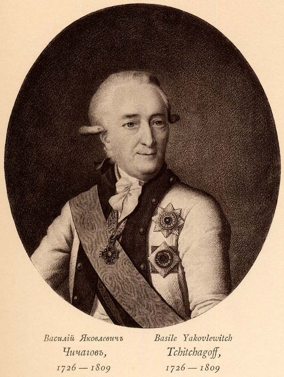 Чичагов Василий Яковлевич (1726-1809) – адмирал. Родом из семьи дворян Костромской губернии. По окончании Морского училища был зачислен во флотскую службу гардемарином, затем произведен в штаб-офицеры. Возглавил экспедицию (1765-1766) к берегам Камчатки по отысканию Северного морского пути. Но из-за тяжелых льдов она не увенчались успехом. И все же был собран большой материал о природе Гренландского моря, составлены подробные карты. В 1772-1773 годах В. Я. Чичагов был главным командиром Кронштадтского порта. Во время русско-турецкой войны командовал отрядом Донской флотилии, оборонявшей Керченский пролив. Был произведен в вице-адмиралы и назначен членом Адмиралтейств-коллегии. В 1782 стал адмиралом. В. Я. Чичагов – единственный моряк – кавалер ордена Св. Георгия I степени.