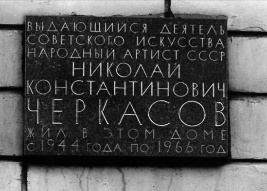 Черкасов Николай Константинович (1903–1966) - актер театра и кино. Родился в Петербурге, в семье железнодорожного служащего. В 1919 г., после окончания краткосрочных курсов мимистов, открытых при Петроградском театре оперы и балета, был зачислен по конкурсу мимистом 3-й категории в штат театра. В 1923 г. поступил в Институт сценических искусств, участвовал в спектаклях петроградской Студии молодого балета. В кино впервые снялся в фильме «Поэт и царь» (парикмахер Шарль,1927). С 1933 г. работал в Академическом театре драмы им А. С. Пушкина. Первые роли: Сенечка Печатник в «Чужом ребенке» Шкваркина и Варлаам в «Борисе Годунове» Пушкина. Затем снимался в фильмах «Петр Первый» (царевич Алексей), «Дети капитана Гранта» (Жак Паганель), «Депутат Балтики» (профессор Полежаев). В 1938 г. с большим успехом снялся в роли Александра Невского в одноименном фильме. В 1941 г. театр эвакуировался в Новосибирск. Здесь актер играл в спектакле «Фронт» А. Корнейчука, снялся у С. Эйзенштейна в роли Ивана Грозного в одноименном фильме. Вернувшись в Ленинград, он играет Ивана Грозного на сцене, в пьесе В. Соловьева «Великий государь». В 1948 г. его избирают председателем Ленинградского отделения ВТО, которое он будет возглавлять до конца жизни. В 1950-60 гг. играет Хлудова в спектакле «Бег» М. Булгакова, продолжает сниматься в кино (роль Стасова в фильме «Мусоргский»), Дронова во «Все остается людям» С. Алешина.