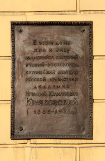 Крачковский Игнатий Юлианович (1883-1951) – востоковед-арабист, академик Академии наук СССР (с 1921). Почетный член многих зарубежных академий и научных обществ. Родился в Вильно, в семье директора Учительского института. В 1905 г. окончил факультет восточных языков Петербургского университета. С 1910 г. и до конца своей жизни преподавал в Петербургском (Ленинградском) университете (с 1918 г. – профессор), одновременно работая в Институте востоковедения, где заведовал арабским кабинетом. Автор большого числа научных трудов по литературе, истории, культуре и религии арабского Востока. Большое внимание уделял изучению и описанию средневековых арабских рукописей, истории российско-арабских литературных связей, арабской географической литературы. В 1963 г. им был опубликован комментированный перевод Корана на русский язык. Он также был редактором первого полного перевода «1001 ночи». Большой популярностью у массового читателя пользовалась его книга «Над арабскими рукописями», переведенная на многие языки (в том числе, на арабский) и удостоенная Государственной премии. Похоронен в Санкт-Петербурге на Литераторских мостках.