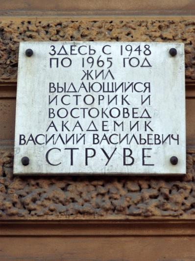Струве Василий Васильевич (1889-1965) – ученый-востоковед. Родился в Санкт-Петербурге, в семье ученого. Еще в школьные годы увлекся историей. В 1911 году окончил историко-филологический факультет университета, занимался историей Востока. Первая его научная работа была посвящена знаменитым египетским сфинксам из храма Аменхотепа III (ныне стоящим на Университетской набережной). Вся жизнь Василия Васильевича была связана с Петербургом. Он работал в Эрмитаже и в Институте востоковедения, преподавал в университете, заведовал кафедрой истории Древнего Востока. Он углубленно изучал историю Древнего Египта и Двуречья, Палестины и Финикии, занимался изучением Хеттского государства и Боспорского царства. В 1934-1939 годах избирался народным депутатом Ленсовета. В. В. Струве - редактор ряда научных периодических изданий и коллективных исторических трудов, один из главных инициаторов издания «Советской исторической энциклопедии».