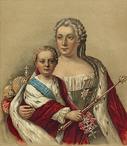 Иоанн VI Антонович (1740-1764) – пятый российский император с октября 1740 по ноябрь 1741, из династии Романовых (Вельфов), правнук брата Петра I Ивана V, сын Анны Леопольдовны и герцога Антона Ульриха Брауншвейгского. Родился в Петербурге. Бездетная императрица Анна Иоанновна хотела сохранить трон за потомками своего отца, Ивана V, и, опасаясь потомков Петра I, перед своей кончиной назначила Иоанна Антоновича наследником. Так после ее смерти двухмесячный ребенок был возведен на российский престол, но вскоре был свергнут Елизаветой Петровной, содержался в тайном заточении в разных местах, с 1756 г. – в Шлиссельбургской крепости, в одиночной камере, в полной изоляции. В июле 1764 г., уже в царствование Екатерины II, прекрасно знающей об узнике, подпоручик Мирович, несший караульную службу в крепости, привлек на свою сторону часть гарнизона, арестовал коменданта и потребовал выдачи заключенного. Охрана капитулировала, предварительно умертвив узника. Ввиду бессмысленности дальнейших действий Мирович сдался властям и был казнен. Существует неподтверждённая версия, согласно которой его спровоцировала Екатерина, чтобы избавиться от бывшего императора.