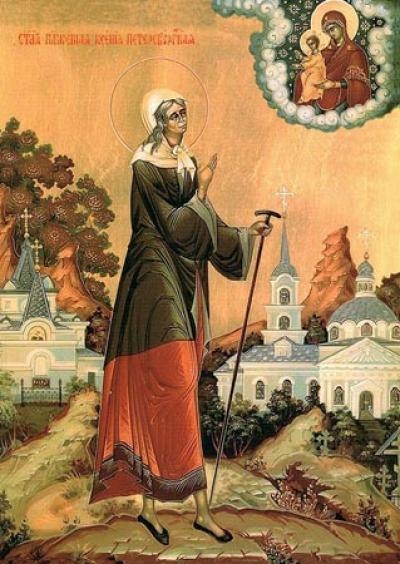 Ксения Блаженная. Родилась между 1719 и 1730 годами. О родителях ее, о детских и отроческих годах ничего не известно. По достижении совершеннолетия сочеталась браком с придворным певчим и жила с супругом в Санкт-Петербурге. Но на 26-м году жизни стала вдовой. Удар оказался настолько сильным и неожиданным, что определил ее дальнейшую судьбу. Она раздала все имущество бедным, облачилась в одежду мужа, откликалась только на его имя, уверяла, что он вовсе не умирал. И прослыла городской блаженной. Горожане верили в ее пророческие (Ксения предрекла кончину императрицы Елизаветы Петровны и юного императора Иоанна Антоновича) и целительские способности, искали и находили утешение в беседах с ней. Свой подвиг добровольного безумия Ксения несла 45 лет. В результате многолетнего народного почитания была причислена к лику святых.