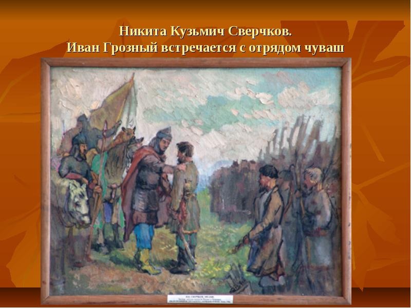 Народный художник Чувашии, заслуженный деятель искусств РСФСР Н.К. Сверчков родился и вырос в Чувашии, в крестьянской семье. По окончании Казанской художественной школы поступил вне конкурса в Академию художеств и скоро стал известен как мастер жанровой живописи. Вся творческая и педагогическая деятельность Н.К. Сверчкова прошла в Чебоксарах. Многие его картины вошли в сокровищницу чувашского изобразительного искусства. Как мастер жанровой живописи он известен картинами «Насильственное крещение чуваш», «Хоровод», «Чувашская свадьба».