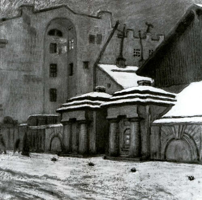 Добужинский Мстислав Валерьянович (1875-1957) – график, живописец, театральный художник. Учился в Рисовальной школе, на юридическом факультете Петербургского университета, затем сам стал преподавателем. Член объединения «Мир искусства». Особое место в его творчестве занимали пейзажи городов, прежде всего Петербурга, представленные в непарадном, иногда призрачном и трагическом облике: «Уголок Петербурга», «Домик в Петербурге», «Петербург» – пастель, гуашь, цикл литографий «Петербург в 1921 г.» и др. Художник иллюстрировал повести «Станционный смотритель» А. С. Пушкина (1906) и «Портрет» Н. В. Гоголя (1909), сказку «Свинопас» Х. К. Андерсена (1917). Особенно знамениты иллюстрации к роману «Белые ночи» Ф. М. Достоевского (1923). Рисовал и для журналов «Мир искусства», «Золотое руно», «Аполлон» и др., оформлял драматические спектакли для театров, участвовал в оформлении массовых театрализованных представлений. В 1924 г. эмигрировал. В 1943 г. исполнил цикл воображаемых пейзажей блокадного Ленинграда.