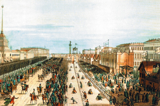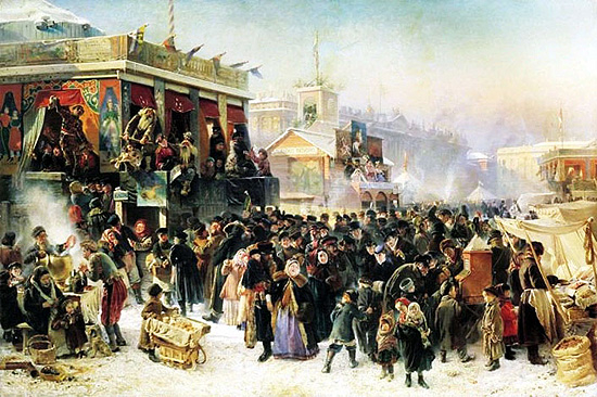 Масленица (масленка, масляна) – праздник проводов зимы, встречи весны – проводилась перед Великим постом в сыропустную неделю православного календаря и заканчивалась в последнее воскресенье перед постом. По канонам православной церкви сыропустная неделя предназначалась для подготовки верующих людей к посту, когда каждый из них должен был проникнуться настроением, соответствовавшим наступающему времени телесного воздержания и напряженных духовных размышлений. В традиционном русском быту эта неделя стала самым ярким, наполненным радостью жизни праздником. Масленица называлась честной, широкой, пьяной, обжорной, разорительницей. Говорили, что она «целую неделю пела-плясала, ела-пила, друг ко дружке в гости хаживала, в блинах валялась, в масле купалась». Масленица отмечалась по всей России: «хоть себя заложи, а Масленицу проводи». Главным развлечением жителей Петербурга было гулянье всей семьей по центральным улицам, катание на лошадях и на санках с горок. На улицах шла праздничная торговля: блины, пироги, пряники, орехи, изюм, семечки, горячий чай, сбитень, свистульки, «тещины языки», детские игрушки, всякий красный товар: ленты, колечки, бусы и т.п. Палатки, ларьки были украшены флажками, лентами, искусственными цветами. В собственных экипажах, запряженных парой сильных лошадей, по Невскому проспекту, Дворцовой площади, вдоль набережной Невы катались люди богатые и знатные. Рядовые петербуржцы любили прокатиться на «вейках» – легких саночках, запряженных малорослой лошадкой. Вейками управляли ингерманландские финны, приезжающие из окрестных деревень. Они громко кричали: «Вейко, вейко (брат), прокатимся». Катание на санках происходило обычно на площади около Адмиралтейства, где ставились деревянные катальные горки, покрывавшиеся толстым слоем льда. Разбег санок был такой сильный, что они достигали Дворцовой площади. В настоящее время центр праздника переместился в Елагиноостровский парк.