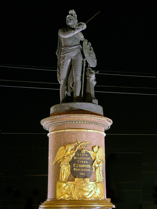Памятник А. В. Суворову был торжественно открыт 5 мая 1801 г., в первую годовщину смерти Суворова, на Марсовом поле. Генералиссимус представлен в образе древнеримского бога войны Марса. Автор памятника – скульптор М. Козловский, пьедестал изготовлен по проекту архитектора А. Воронихина. Мастер Ф. Гордеев создал на пьедестале барельеф, где в аллегорической форме изображены Слава и Мир, которые осеняют щит с надписью: «Князь Италийский, граф Суворов Рымникский, 1801 г.». Эти титулы напоминают о самых громких победах Суворова. В 1818 г. монумент перенесен на Суворовскую площадь, где и находится в настоящее время. Памятник стал символом доблести отечественного оружия и непобедимости российской армии.