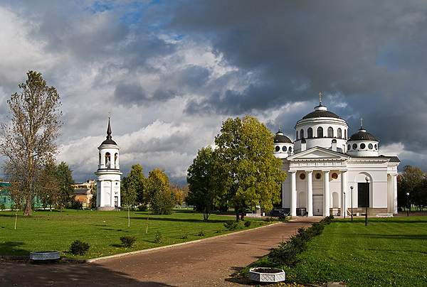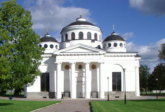 Софийский собор – памятник архитектуры строгого классицизма. Построен в 1782–1788 гг. Архитекторы: Ч. Камерон, И. Е. Старов. Огромный массив здания с колоннами дорического ордера увенчан пятью куполами на невысоких цилиндрических барабанах. В архитектурном оформлении интерьеров собора использован ионический ордер. Высокий многоярусный иконостас принадлежал к числу самых красивых иконостасов храмов столицы и ее пригородов. Среди живописных работ выделялись картины «Введение во храм Пресвятой Богородицы» (художник П. И. Соколов) и «Явление Иисуса Христа апостолу Фоме» (художник Г. И. Угрюмов). Среди достопримечательностей собора было великолепное серебряное паникадило, весившее более 85 кг. Оно было подарено собору Екатериной II. В 1817 г. Софийский собор стал церковью лейб-гвардии Гусарского полка. Здесь хранились георгиевские штандарты и полковые награды. На стенах размещались мраморные доски с именами офицеров полка, погибших в сражениях. В 1904 г. архитектор Л. Н. Бенуа возвел рядом с собором отдельно стоящую колокольню в стиле классицизма. В ее нижнем этаже была устроена церковь во имя преподобного Серафима Саровского. Вскоре после октябрьских событий 1917 г. собор был закрыт, его внутреннее убранство расхищено, иконостас уничтожен, мемориальные доски сорваны и разбиты. В годы Великой Отечественной войны собор серьезно пострадал. В последующие годы храм продолжал медленно разрушаться. Возвращен общине в 1989 г. Отреставрирован в 1994 г. Включен в список памятников архитектуры федерального значения. Собор поддерживает традиции, присущие полковому храму. В настоящее время тесное сотрудничество связывает храм с расположенными в Пушкине военными учебными заведениями. Ежегодно в стенах и на территории собора совершаются молебны для военнослужащих и курсантов, принимается присяга.