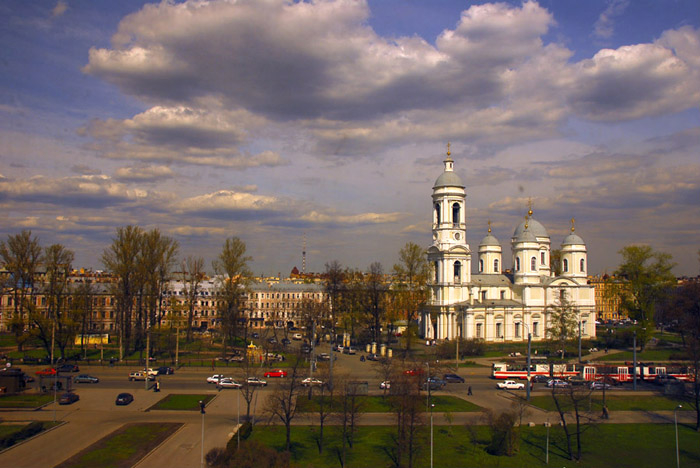 Архитектурный стиль – переходный от барокко к классицизму. Авторы проекта: А. Ринальди, И. Е. Старов. Основатель: Екатерина II. Строительство велось в 1766-1789 гг. Первыми храмами на месте собора была деревянная церковь Святителя Николая, построенная в 1708 г., затем Успенская церковь – (1713-1719), получившая в 1740 г. статус собора. Рядом с ним по указу императрицы Анны Иоанновны был заложен одноглавый каменный храм (архитекторы М. Г. Земсков и П. А. Трезини). С 1766 по 1789 гг. велась перестройка Успенского собора под руководством А. Ринальди и И. Е. Старова. Новый собор освятили в честь святого князя Владимира. Главный объем собора увенчан мощным пятиглавием, интерьер разделен пилонами на три нефа, стены расчленены пилястрами дорического ордера. В 1872-1873 гг. архитектором Н. Ф. Брюлловым была выстроена ограда с двумя часовнями. С 1938 по 1941 гг. в соборе была резиденция митрополита Ленинградского Алексия. Адрес: ул. Блохина, 26.