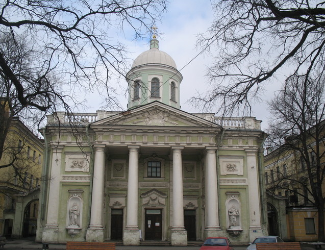 Памятник архитектуры раннего классицизма. Церковь сооружена в 1768-1771 гг. архитектором Ю. М. Фельтеном при поддержке императрицы Екатерины II для нужд лютеранской общины Васильевского острова, которая была образована ранее, в 1728 г. Фасад оформлен портиком дорического ордера и легким куполом, интерьер, разделенный коринфскими колоннами на три нефа, украшен позолотой, статуями скульптора А. Р. Бока и картинами на религиозную тему художников Г. Пфанцельта, Г. И. Козлова и Э. Гриммеля. В 1852 г. в церкви был установлен орган фирмы Т. Метцеля. В конце 19-го века большую известность приобрел один из пасторов церкви, И. Х. Грот, автор книги по истории протестантизма в России. К 1909 г. приход насчитывал около 8 тысяч человек, главным образом немцев. В начале 1920-х гг. храм был передан общине евангельских христиан-баптистов, а в 1930 г. закрыт и переоборудован под клуб горняков, затем использовался как зал звукозаписи. В 1990 г. в помещении бывшего храма были возобновлены богослужения, а в 1997 г. храм был возвращен общине. В 1999 г. в церкви был смонтирован орган знаменитой фирмы Зауэр (на тот момент - самый большой в Петербурге).