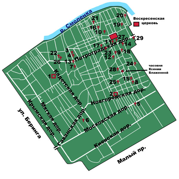 Смоленское православное кладбище располагается в западной части города, на Васильевском острове, возле реки Смоленки. Учреждено в 1756 г. по указу Синода. На территории Смоленского кладбища осталась лишь каменная Смоленская церковь, возведенная в 1786-1790 гг. архитектором А. А. Ивановым. Каменную Троицкую церковь разобрали в 1932 г., а Воскресенская церковь у входа на кладбище сохранилась лишь в руинированном виде. Самым популярным местом у верующих является небольшая часовня (архитектор А. А. Всеславин, 1902 г.), где хранятся мощи Блаженной Ксении Петербургской. В годы Великой Отечественной войны здесь в братских могилах хоронили погибших. На кладбище были похоронены выдающиеся деятели русской науки и искусства XVIII-XX вв., такие как А. Блок, И. Бубнов, С. Нахимов, А. Можайский, П. Семенов-Тян-Шанский, Л. Чарская, А. Бахтин, няня А. С. Пушкина Арина Родионовна (об этом свидетельствует установленная у входа на кладбище мемориальная доска, хотя могилы в настоящее время не имеется). Здесь находилась первая могила Тараса Шевченко, затем его прах был перенесен на Украину.
