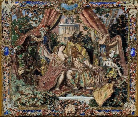 Внезапно среди ночного безмолвия часы резко отбивают полночь. Бронзовый Амур оживает, повелевает Сатурну исчезнуть и выпускает из ящика Гениев часов. Все увлекающее за собой Время перестает властвовать, и вещи давно минувшие становятся вновь действительными. Амур раздвигает занавеси кровати и будит Ренэ. Слышатся манящие звуки, точно где-то далеко происходит торжество. Ренэ старается разбудить Баттиста, но тот спит летаргическим сном. Звуки усиливаются. Картина-шпалера освещается изнутри. Мало-помалу весь павильон превращается в роскошный сад, наполненный костюмированными в сказочные наряды царедворцами. Посреди сидит на возвышении сама Армида, все еще как бы повязывая через плечо Ринальдо расшитый ею шарф (как в изображении на гобелене), хотя самого Ринальдо нет. Вот царица ожила и в недоумении ищет, где плененный ею герой. Напрасно с тоской вопрошает она придворных: он исчез бесследно. Но является ее отец — царь Гидрао — и указывает Армиде на Ренэ.