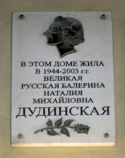 Дудинская Наталья Михайловна (1912-2003) – балерина, народная артистка СССР, Почетный гражданин Санкт-Петербурга. Родилась в Харькове. В 1931 году, сразу же после окончания Ленинградского хореографического училища по классу А. Вагановой (ул. Зодчего Росси, 2), дебютировала на сцене Академического театра оперы и балета им. Кирова (Мариинского - пл. Театральная, 1) в классическом трио в балете «Лебединое озеро» П. И. Чайковского. Среди лучших ролей Н. М. Дудинской – Раймонда, девушка-птица («Шурале»). В истории русского балета Наталья Михайловна навсегда останется как выдающийся балетный педагог. Более полувека она была ведущим профессором Академии русского балета имени А. Вагановой (ул. Зодчего Росси, 2), а также в хореографических школах США, Японии, Польши, Финляндии. В 1994 и 1996 годах Национальный биографический институт США признавал российскую балерину «Женщиной года». Н. М. Дудинская снималась в кинокартинах «Дон Сезар де Базан» и «Я вас любил». Ее творчеству посвящены фильмы «Класс Дудинской» и «Диалог со сценой».