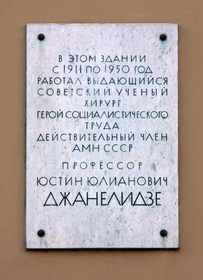 Джанелидзе Иустин Ивлианович (Юстин Юлианович) (1883-1950) – ученый. Родился в Имеретии (Грузия), в крестьянской семье. Окончил Кутаисскую классическую гимназию. Учился в Харьковском университете, но в 1905 г. за участие в студенческих волнениях был из него исключен и медицинское образование завершил в Швейцарии. Диплом врача получил уже в Московском университете. С 1911 г. работал в Петербургском женском медицинском институте. В 1913 г. впервые в мире успешно зашил рану входящей аорты. С 1921 г. – профессор Петроградского медицинского института (ныне Мед. университет им. И. П. Павлова), в 1939-м был назначен главным хирургом Военно-морского флота, затем – профессор Военно-морской медицинской академии, заместитель главного хирурга Вооруженных Сил страны. И как ученому, и как практику ему принадлежит ряд крупных научно-исследовательских работ в области медицины: по хирургии сердца и сосудов, травматологии, неотложной и военно-полевой хирургии и др. Он был избран председателем правления Всесоюзного общества хирургов. Лауреат Государственных премий, генерал-лейтенант медицинской службы, заслуженный деятель науки РСФСР, награжден высокими правительственными наградами.