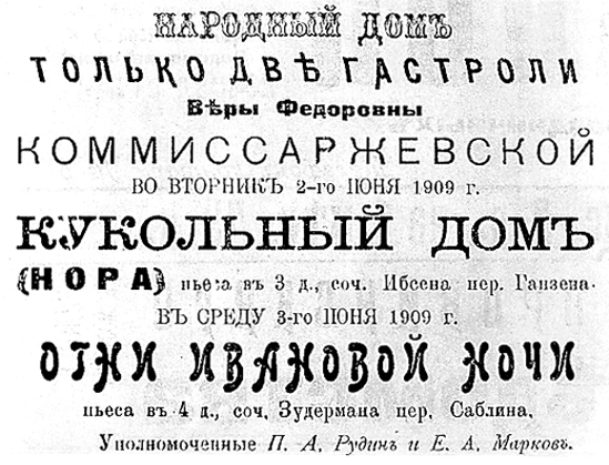 Комиссаржевская Вера Федоровна (1864-1910) – актриса. Родилась в Петербурге, в семье оперного певца. Из-за частых переездов переменила несколько гимназий. Актерскому мастерству училась у артиста В. Н. Давыдова и у своего отца. Дебютировала на любительской сцене. Будучи в Москве, участвовала в спектаклях Общества искусства и литературы, которым руководил будущий великий режиссер К. С. Станиславский. В 1896 г. была приглашена в Александринский театр, где сразу же приобрела известность искренностью, глубиной чувств (роль Нины Заречной в «Чайке» А. П. Чехова). В 1904 г. основала свой театр, открывшийся в помещении петербургского Пассажа. Накануне первой русской революции театр оказался в центре общественного внимания. Вместе с В. Э. Мейерхольдом она искала в режиссуре нечто другое, обращалась к новым для сцены авторам – А. Блоку, М. Метерлинку, Ф. Сологубу и др. Мечтала создать школу-студию для актеров будущего, совершенного искусства. Оставила яркий след в театре своего времени.