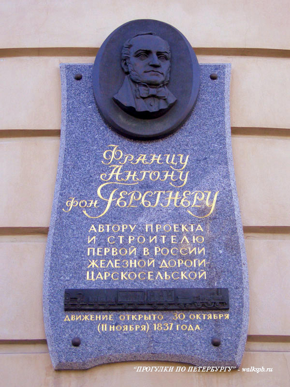 Герстнер Франц Антон фон (1796-1840) – австрийский инженер. В 1834 г. прибыл в Россию для обозрения горных заводов. Он объездил многие губернии центра России и по возвращении в столицу изложил императору Николаю I свои соображения о необходимости строительства железных дорог. Было решено для начала строить Царскосельскую железную дорогу. Пробная поездка проходила в 1836 г. на участке между Павловском и Царским Селом, в присутствии Николая I с семьей и большого количества людей из всех классов общества. Официальное открытие железной дороги состоялось 30 октября 1837 г.