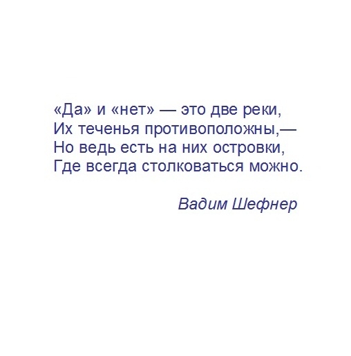 «Да» и «нет» — это две реки, Их теченья противоположны,— Но ведь есть на них островки, Где всегда столковаться можно. Вадим Шефнер