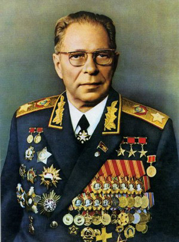 Устинов Дмитрий Федорович (1908-1984) - советский военный и партийный государственный деятель. До Великой Отечественной войны выпускник Ленинградского военно-механического института Д. Устинов работал инженером-конструктором, затем заместителем главного конструктора и директором завода «Большевик». С 1941 по 1953 гг. был народным комиссаром (с 1946 года – министром) Вооруженных сил СССР. Он внес крупный вклад в увеличение выпуска вооружений для советских войск, участвовал в разработке новейшего оружия для армии и флота. В 1953 г. был назначен министром оборонной промышленности, а с 1976 по 1984 гг. занимал пост министра обороны СССР.