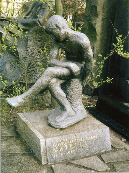 Матвеев Александр Терентьевич (1878–1960) - художник, скульптор. Выходец из семьи торгового служащего. Учился в Московском училище живописи, ваяния и зодчества, участвовал в выставках «Мира искусства» и «Голубой розы». В 1908–1911 гг. Матвеев работает над статуями для архитектурно-паркового ансамбля виллы Я. Е. Жуковского в Крыму. Хрупкие беломраморные фигуры представлены в состоянии словно призрачного сна. В 1910–1912 гг. А. Матвеев создает одно из самых одухотворенных произведений русской мемориальной пластики – надгробие рано умершему живописцу В. Э. Борисову-Мусатову: глубокая печаль воплотилась в распластанной, будто раненая птица, фигурке мальчика, вырубленной в граните. После Октябрьской революции, согласно плану монументальной пропаганды, работает над памятником К. Марксу, который был установлен в 1918 г. перед зданием Смольного (памятник не сохранился). К 10-летию Октябрьской революции А. Матвеев создал скульптурную группу «Октябрь», которая по своей смелости и новаторству стала классикой советского искусства. В советское время он работал для Петроградского фарфорового завода, создавая изысканные образцы пластики малых форм, преподавал в Ленинградской Академии художеств. В 1925 г. скульптору была присуждена золотая медаль на международной выставке художественно-декоративных искусств в Париже за фарфоровые статуэтки «Купальщица», «Флора» и др.