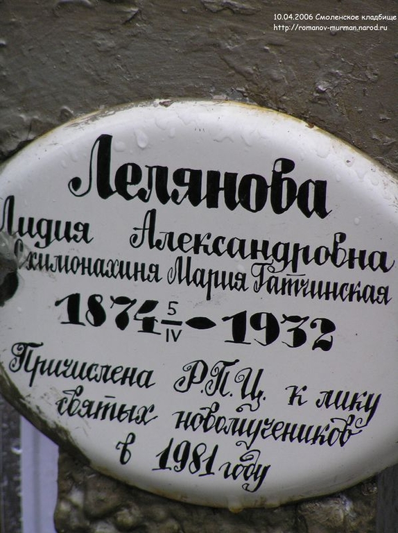 Мария Гатчинская (в миру Лидия Александровна Лелянова) (1874-1932) – православная святая, схимонахиня. Родилась в Петербурге, в семье купца. Окончила гимназию. В возрасте 16 лет заболела и лежала парализованная, обнаружив при этом дар утешать скорбящих. В Гатчину болящую перевезли, когда надежды на выздоровление уже не было. 17 февраля 1932 года в ходе акции по «изъятию монашек и монахов», которую ОГПУ проводило тогда по всей стране, Л. А. Лелянова была арестована. Привезенной на грузовике из Гатчины калеке предъявили обвинение в «участии в нелегальных сборищах». Действительной же причиной ареста было огромное духовное влияние матушки Марии на людей. Умирающую осудили на три года ссылки и поместили в больницу Дома предварительного заключения. К лику святых Мария Гатчинская причислена сначала Русской православной церковью за рубежом, а через 25 лет и на родине. 26 апреля 2009 года в Гатчине впервые состоялся крестный ход в память небесной покровительницы города — святой преподобной мученицы Марии Гатчинской.