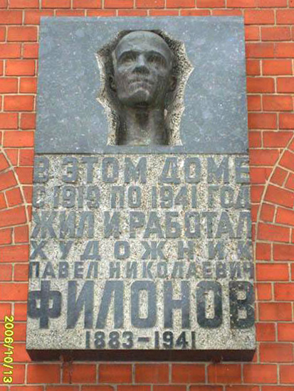 Филонов Павел Николаевич (1883–1941), художник, теоретик искусства. Родился в Москве, в мещанской семье. После переезда в Петербург в 1897 г. поступил в живописно-малярные мастерские, посещал вечерние рисовальные классы Общества поощрения художеств. В 1908 г. был принят вольнослушателем в школу при Академии художеств, но вскоре «добровольно вышел» из нее. В 1910 г. П. Филонов участвует в выставке «Союза молодёжи» с первой своей картиной «Головы» (картон, масло). Затем идут следующие выставки («Пир королей», «Крестьянская семья», «Мужчина и женщина»). Осенью 1916 г. П. Филонов был мобилизован и направлен на Румынский фронт рядовым. Затем он принимает активное участие в революции, занимает должность председателя Исполнительного военно-революционного комитета в Измаиле. Вернувшись в Петроград, П. Филонов принял участие в Первой свободной выставке произведений художников всех направлений — грандиозной выставке в Зимнем дворце (1919). Им были представлены полотна из цикла «Ввод в мировой расцвет». Две работы: «Мать» и «Победитель города» – были подарены государству. Другие две работы, том числе «Формула петроградского пролетариата» – Русскому музею. К 1922 г. относится безуспешная попытка реорганизовать живописный и скульптурный факультеты Академии художеств в Петрограде — идеи реформатора не находят официальной поддержки. Постепенно вокруг художника воздвигается стена изоляции и отвержения. Мастер голодает, но пишет масляными красками по бумаге или картону последние свои шедевры «Формула империализма», «Нарвские ворота», «Животные», «Лики». Художник принципиально не продавал своих работ за рубеж, поэтому практически все его наследие хранится в Русском музее.