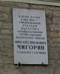 Чигорин Михаил Иванович (1850-1908) – шахматист. Родился в Гатчине, в семье заводского мастера. В восемь лет осиротел и был отправлен в Гатчинский сиротский институт. Затем поступил на государственную службу, но вскоре оставил ее, отдавшись исключительно шахматному искусству. В 1874 году уже участвовал в турнире с известными петербургскими шахматистами. В 1878 году получил первый приз в турнире всех сильнейших игроков своего времени. Он показал себя и замечательным шахматным аналитиком, участвуя в матче по переписке Петербурга с Харьковом, затем в матче по телеграфу с Лондоном. Издавал «Шахматный листок», редактировал «Шахматный вестник», заведовал шахматным отделом российской газеты «Новое время», издаваемой в Петербурге. Михаил Иванович воспитал новое поколение русских шахматных мастеров, создал традиции отечественных шахмат. Шахматной федерацией России в его честь проводятся мемориальные турниры, учреждена медаль его имени.