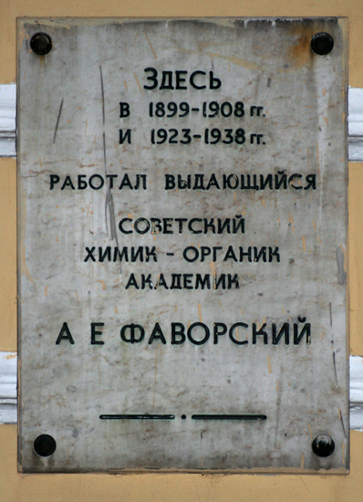 Фаворский Алексей Евграфович (1860-1945) – химик-органик. Родился в Нижегородской губернии, в семье священника. Окончив гимназию, поступил на естественное отделение физико-математического факультета Петербургского университета (1878). В то время там преподавали известные ученые-химики Д. И. Менделеев и А. М. Бутлеров. После окончания университета был оставлен на кафедре органической химии. Здесь же он защитил магистерскую, затем докторскую диссертации, возглавил кафедру технологии и технической химии. Работал также в химико-технологическом институте, стал инициатором создания и директором Института органической химии. Труды ученого стали теоретической базой для важнейших производств, в том числе синтетического каучука. В 1941 г. был открыт способ получения продукта, который стал использоваться для изготовления автомобильных и велосипедных шин, граммофонных пластинок, пластмасс, электроизоляторов и т. п. Лауреат Государственной премии, удостоен многих государственных наград.