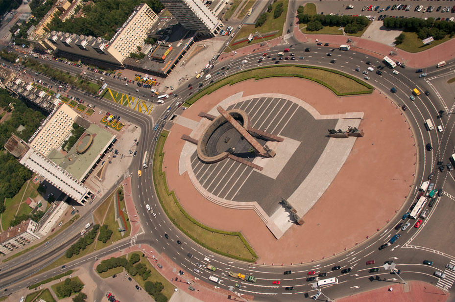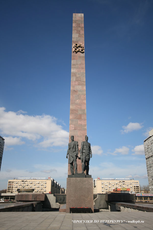 Монумент был открыт 9 мая 1975 г. к 30-летию победы в Великой Отечественной войне. Авторы мемориального комплекса - лауреаты Государственной премии, народные художники СССР С. Сперанский, В. Каменский, М. Аникушин. Южный фасад мемориала – «Площадь Победителей». На гранитных пилонах установлены 26 бронзовых скульптур – это образы защитников Ленинграда. Главная вертикаль – 48-метровый гранитный обелиск. У его основания – скульптурная группа «Победители»: фигуры рабочего и солдата. Обелиск – связующее звено между «Площадью Победителей» и полукруглым Памятным залом «Блокада». К нему ведут широкие лестницы по обеим сторонам постамента обелиска. По замыслу авторов, поверхность стен сохраняет фактуру деревянной опалубки – такими были оборонительные сооружения военных лет. 23 февраля 1978 г. был открыт подземный Памятный зал. Здесь размещена документально-художественная экспозиция, посвященная обороне и блокаде Ленинграда.