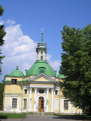 Построена в 1771 г. на месте прежней деревянной (1722 г.), вероятно, по проекту Ф. Б. Растрелли. Храм представляет собой прямоугольный в плане основной объем, завершенный тремя куполами. Стоит она на живописном месте, у плотины, в густом тенистом парке, среди кедров, лип и дубов. Южный вход в церковь оформлен классическим портиком из четырех попарно расположенных колонн, завершенным треугольным фронтоном. Закрытый в 1930 г., храм использовался в качестве склада. В 1993 г. в полуразрушенном виде возвращен верующим. Ныне в восстанавливаемой церкви проводятся богослужения.